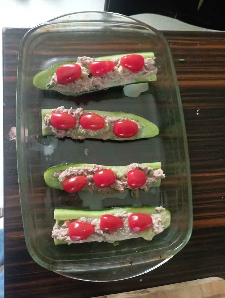 4- Remplis les morceaux avec la crème de thon. Pose une tomate sur chaque morceau. Mets l’assiette 2 heures au réfrigérateur.