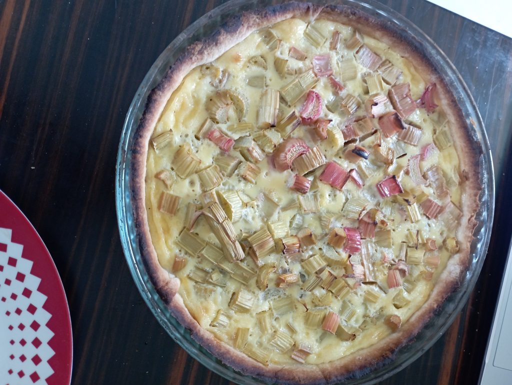 4- Pose la rhubarbe dessus. Mélange les oeufs la crème et le reste du sucre et verse sur la rhubarbe. Fais cuire la tarte pendant 35 minutes.