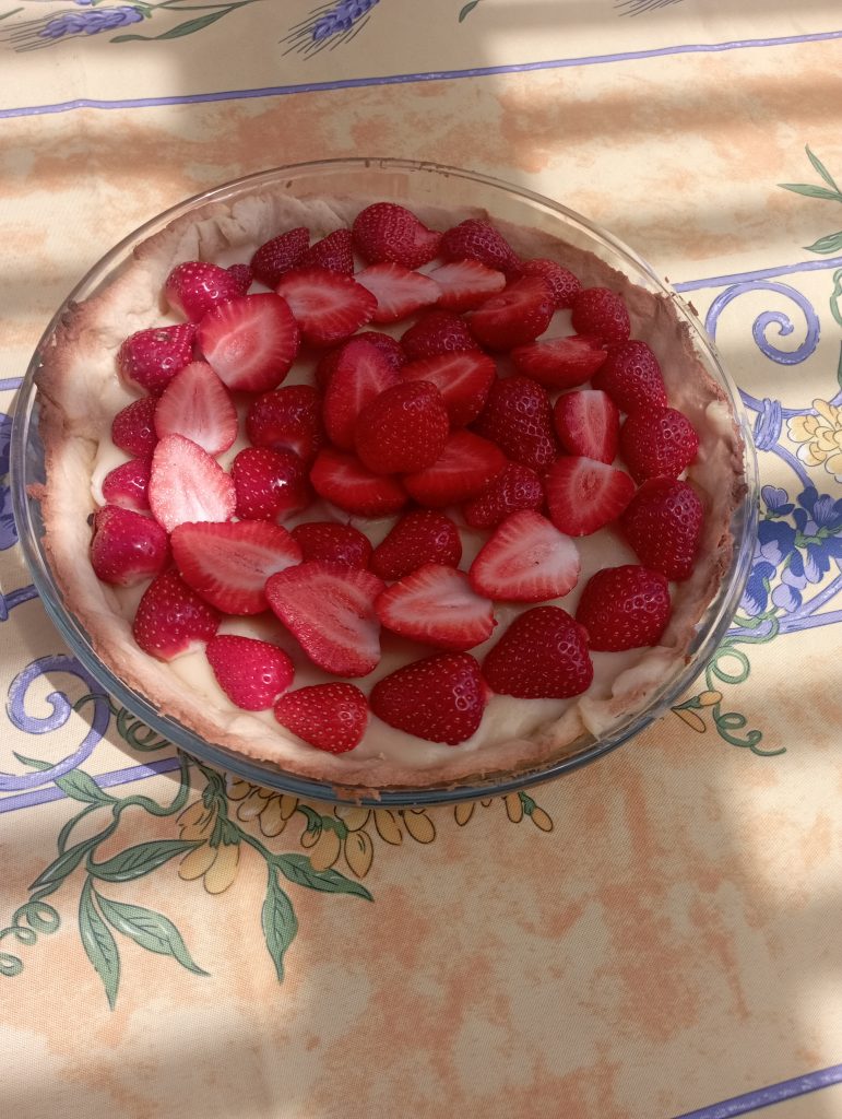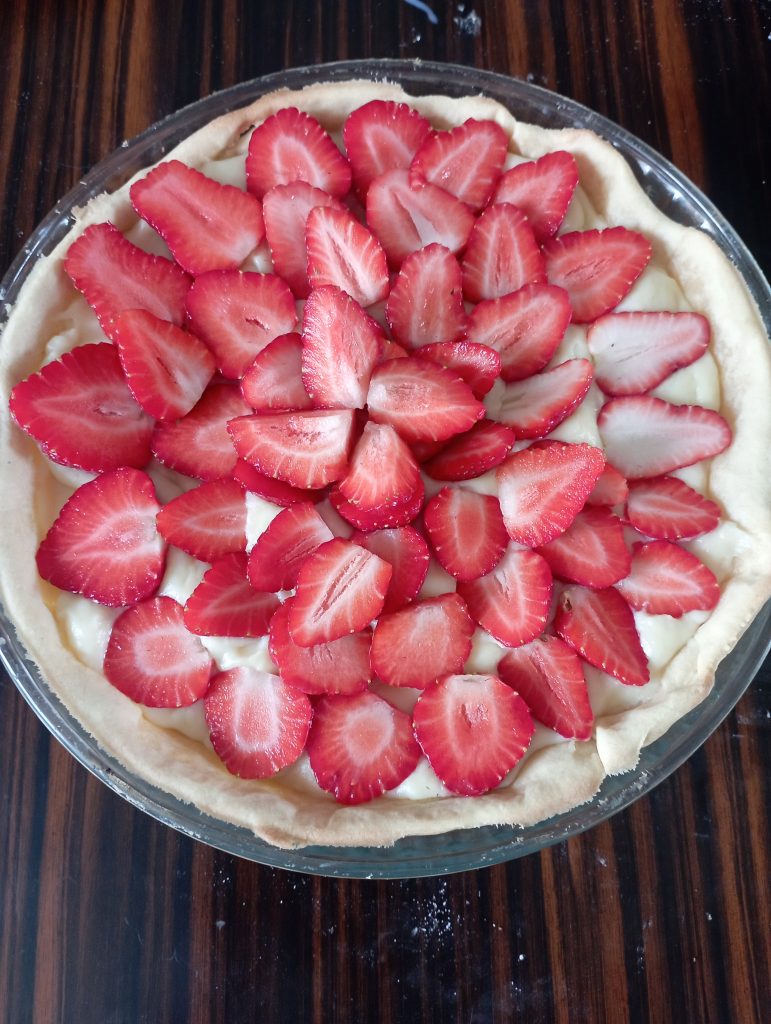 - Coupe les fraises en deux (ou en tranches) et dispose-les joliment sur la crème.