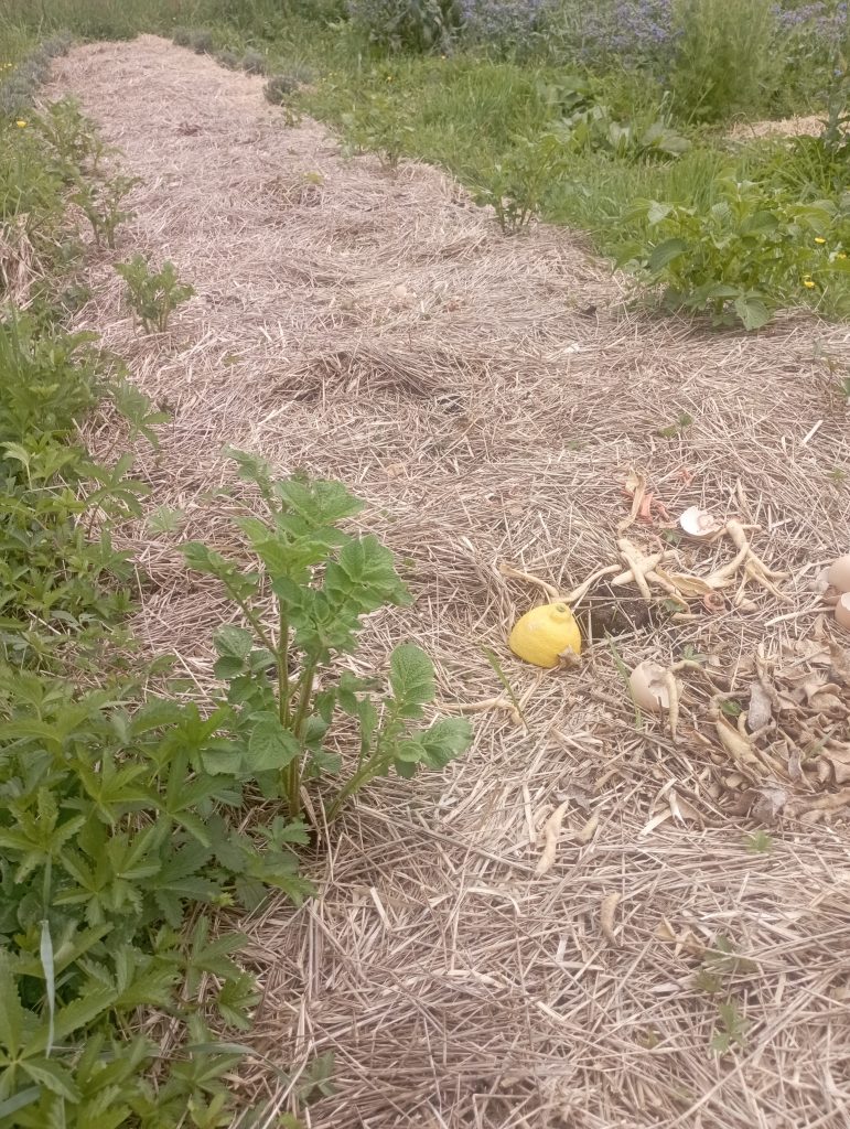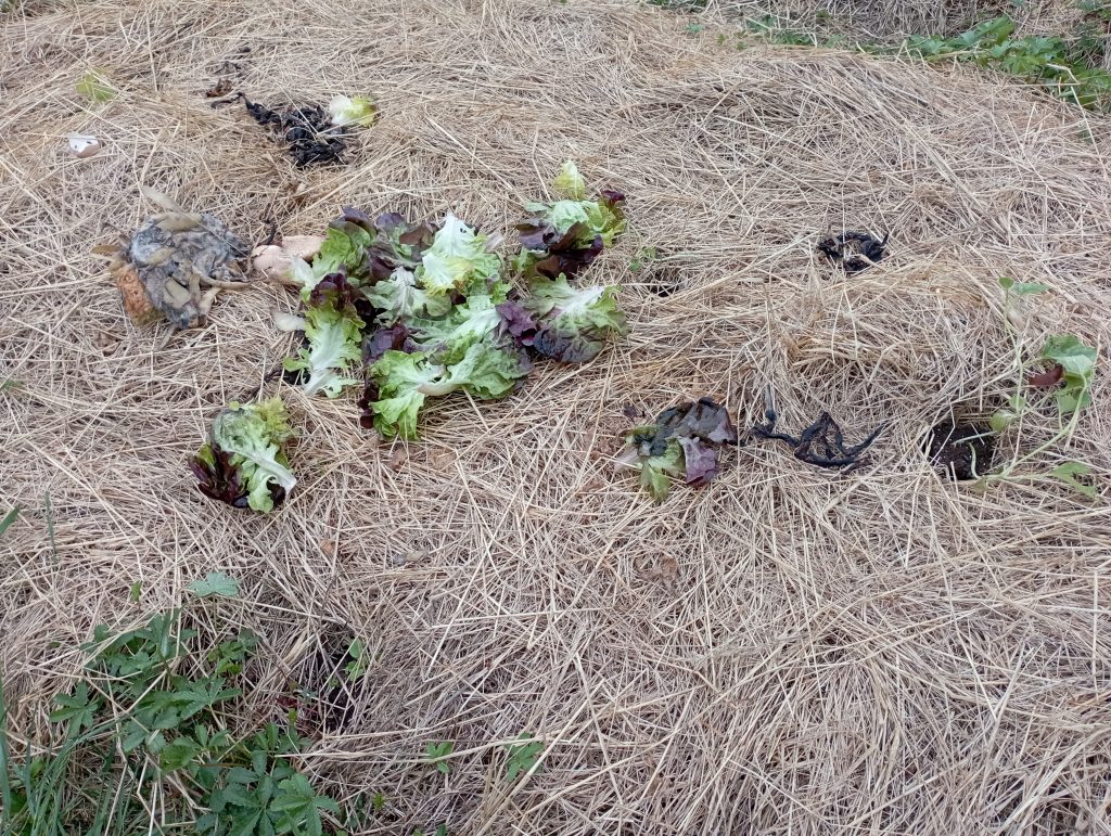 Je vous présente ma façon de composté , c’est du compostage de surface. Il n’y a rien de plus facile que de faire cela . Je prend mes déchets alimentaires comme les épluchures de pomme de terre , la salade plus bonne , les miettes de pain ou le pain plus bon. Et je le balance sur mes parcelles de jardin comme ça :