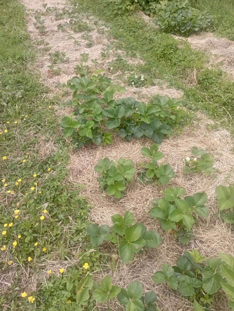 Mes fraisiers qui je l’espère vont bientôt mûrir.
