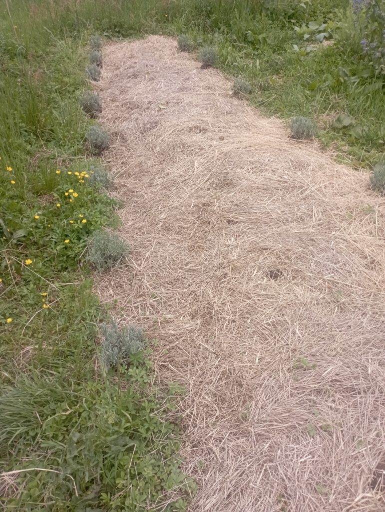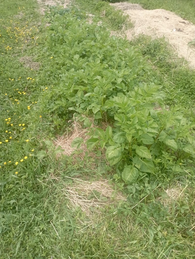 Si, comme moi, vous voulez cultiver selon la méthode de Didier Helmstetter, vous devez tondre la partie que vous souhaitez cultiver, puis la recouvrir de 20 cm de foin. Bien que ce paillage ne soit pas parfait — pour les fraises, par exemple, il vaut mieux utiliser du BRF — moi, je fais tout avec du foin.