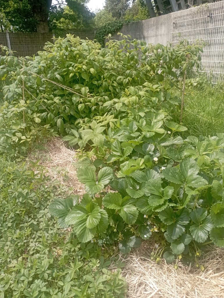 Donc pour commencé la photo de mes fruits rouges deuxièmes années . Le framboisier se bat contre les fraisiers.